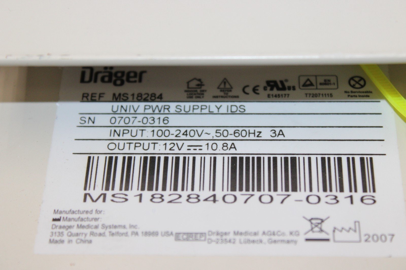 Drager MS18284 Universal Power Supply IDS Input:100-240V/Output 12V 10.8A